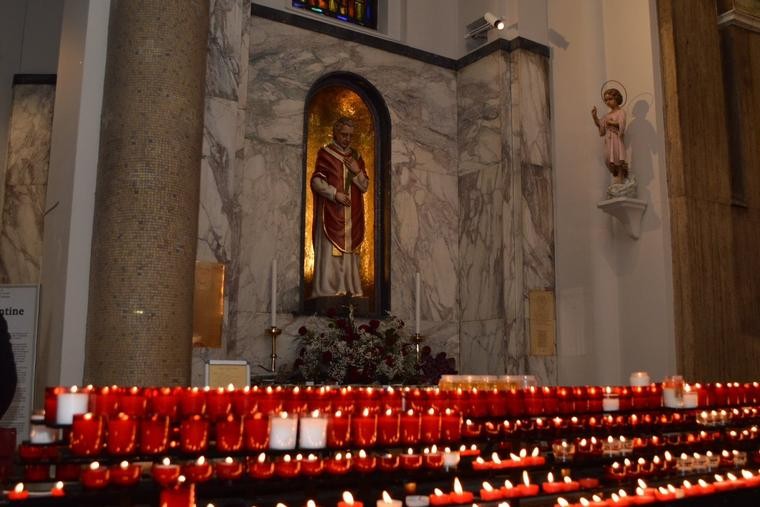 Những ngọn nến được thắp sáng dưới chân tượng Thánh Valentine bên trong Đền thờ Thánh Valentine ở Dublin. (ảnh: Được sự cho phép của Nhà thờ Đức Mẹ Núi Carmel và Đền thờ Thánh Valentine)